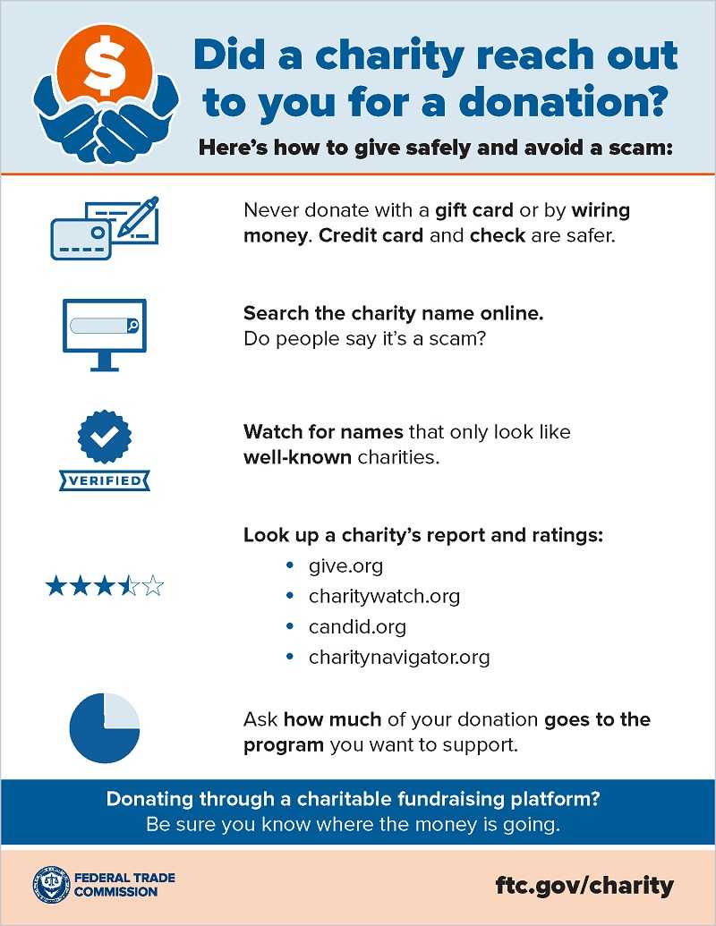 These payment types are favorites of scammers because they’re nearly impossible to trace. Legitimate charities won't request them.