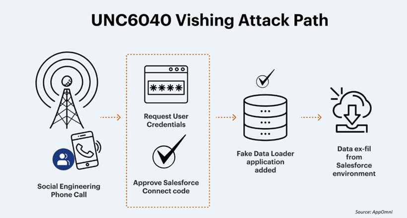 UNC6040 is using social engineering/vishing (phone-based scams). It pretends to be IT support in organizations’ call centers, claiming there’s some system or connectivity issue. During those calls, the attackers trick employees into giving up credentials, MFA codes, or approving malicious connected apps. They also used fake or modified tools like a tampered with version of Salesforce’s Data Loader to pull out large batches of data.